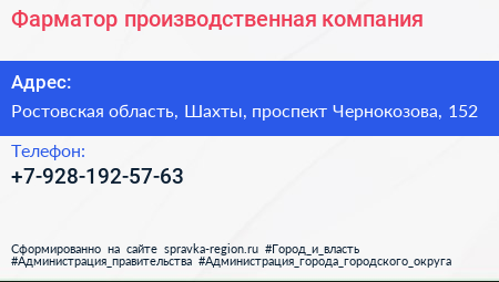 Фарматор, производственная компания по адресу Ростовская область, Шахты, проспект Чернокозова, 152 в дальнейшем Организация, размещена в следующих категориях: