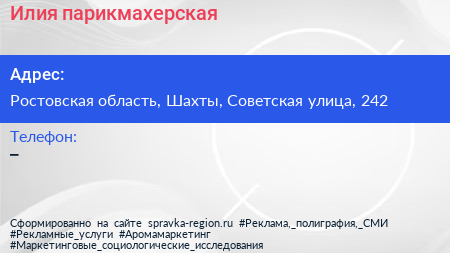 Илия, парикмахерская по адресу Ростовская область, Шахты, Советская улица, 242 в дальнейшем Организация, размещена в следующих категориях: