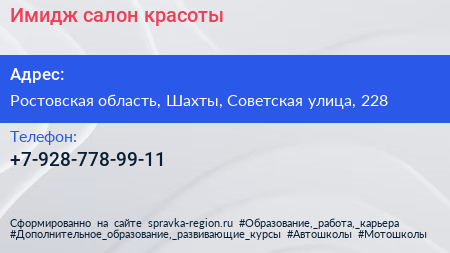 Имидж, салон красоты по адресу Ростовская область, Шахты, Советская улица, 228 в дальнейшем Организация, размещена в следующих категориях: