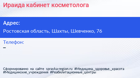 Ираида, кабинет косметолога по адресу Ростовская область, Шахты, Шевченко, 76 в дальнейшем Организация, размещена в следующих категориях: