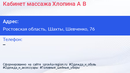 Кабинет массажа Хлопина А.В. по адресу Ростовская область, Шахты, Шевченко, 76 в дальнейшем Организация, размещена в следующих категориях: