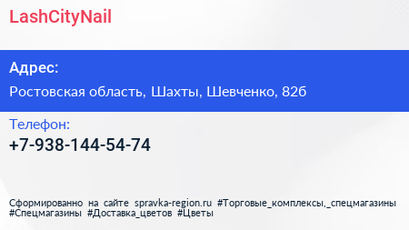 LashCityNail по адресу Ростовская область, Шахты, Шевченко, 82б в дальнейшем Организация, размещена в следующих категориях: