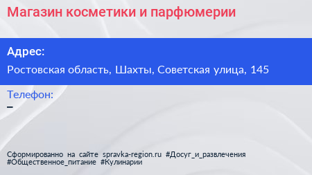 Магазин косметики и парфюмерии по адресу Ростовская область, Шахты, Советская улица, 145 в дальнейшем Организация, размещена в следующих категориях: