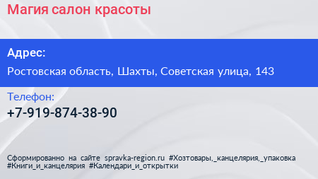 Магия, салон красоты по адресу Ростовская область, Шахты, Советская улица, 143 в дальнейшем Организация, размещена в следующих категориях: