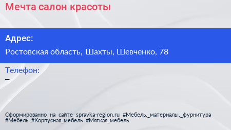 Мечта, салон красоты по адресу Ростовская область, Шахты, Шевченко, 78 в дальнейшем Организация, размещена в следующих категориях: