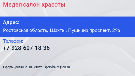 Медея, салон красоты по адресу Ростовская область, Шахты, Пушкина проспект, 29а в дальнейшем Организация, размещена в следующих категориях:
