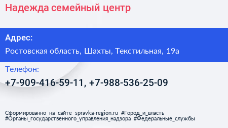 Надежда, семейный центр по адресу Ростовская область, Шахты, Текстильная, 19а в дальнейшем Организация, размещена в следующих категориях: