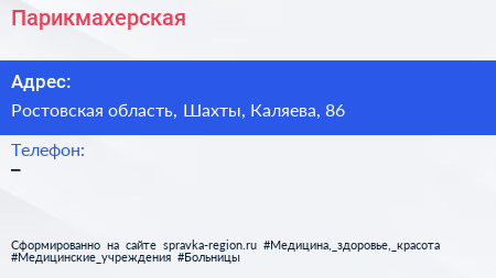 Парикмахерская по адресу Ростовская область, Шахты, Каляева, 86 в дальнейшем Организация, размещена в следующих категориях: