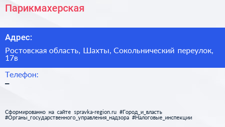 Парикмахерская по адресу Ростовская область, Шахты, Сокольнический переулок, 17в в дальнейшем Организация, размещена в следующих категориях: