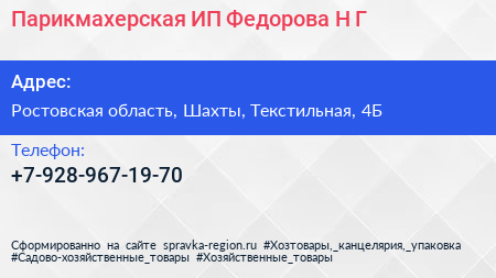 Парикмахерская, ИП Федорова Н.Г. по адресу Ростовская область, Шахты, Текстильная, 4Б в дальнейшем Организация, размещена в следующих категориях: