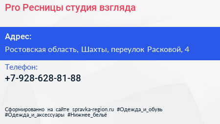 Pro Ресницы, студия взгляда по адресу Ростовская область, Шахты, переулок Расковой, 4 в дальнейшем Организация, размещена в следующих категориях: