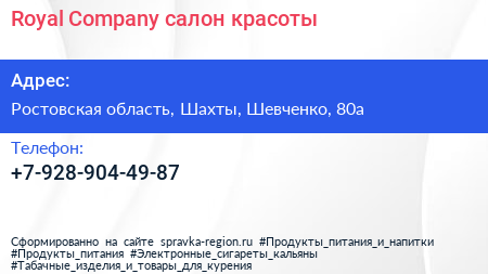 Royal Company, салон красоты по адресу Ростовская область, Шахты, Шевченко, 80а в дальнейшем Организация, размещена в следующих категориях: