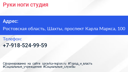Руки-ноги, студия по адресу Ростовская область, Шахты, проспект Карла Маркса, 100 в дальнейшем Организация, размещена в следующих категориях: