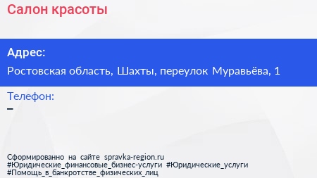 Салон красоты по адресу Ростовская область, Шахты, переулок Муравьёва, 1 в дальнейшем Организация, размещена в следующих категориях: