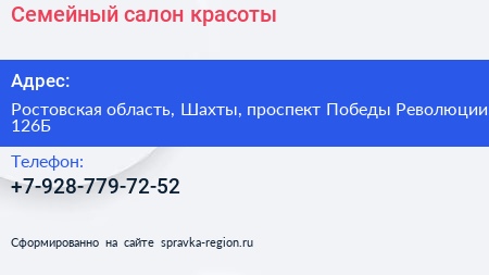 Семейный, салон красоты по адресу Ростовская область, Шахты, проспект Победы Революции, 126Б в дальнейшем Организация, размещена в следующих категориях: