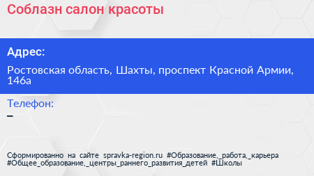 Соблазн, салон красоты по адресу Ростовская область, Шахты, проспект Красной Армии, 146а в дальнейшем Организация, размещена в следующих категориях:
