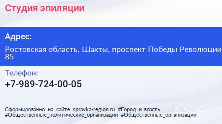 Студия эпиляции по адресу Ростовская область, Шахты, проспект Победы Революции, 85 в дальнейшем Организация, размещена в следующих категориях: