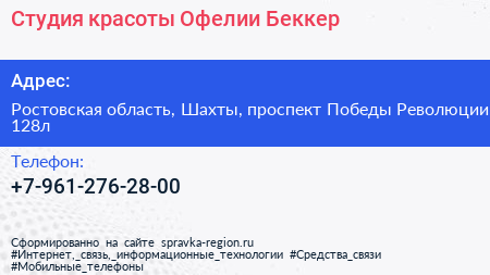 Студия красоты Офелии Беккер по адресу Ростовская область, Шахты, проспект Победы Революции, 128л в дальнейшем Организация, размещена в следующих категориях: