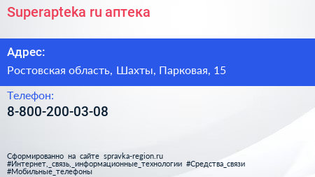Superapteka.ru, аптека по адресу Ростовская область, Шахты, Парковая, 15 в дальнейшем Организация, размещена в следующих категориях: