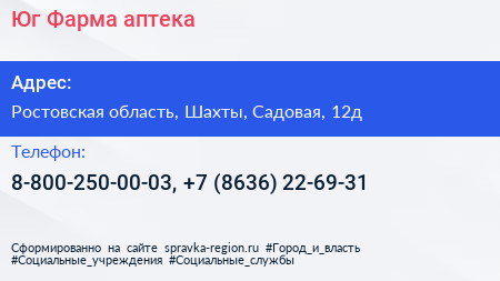 Юг Фарма, аптека по адресу Ростовская область, Шахты, Садовая, 12д в дальнейшем Организация, размещена в следующих категориях: