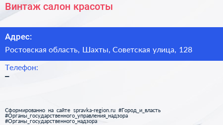 Винтаж, салон красоты по адресу Ростовская область, Шахты, Советская улица, 128 в дальнейшем Организация, размещена в следующих категориях: