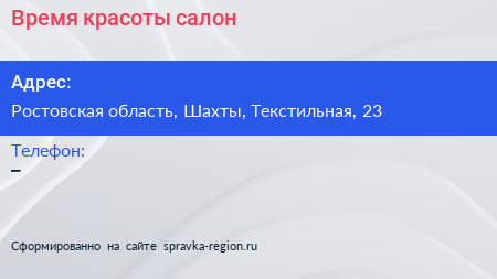 Время красоты, салон по адресу Ростовская область, Шахты, Текстильная, 23 в дальнейшем Организация, размещена в следующих категориях: