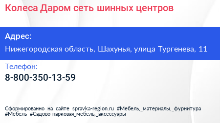 Колеса Даром, сеть шинных центров по адресу Нижегородская область, Шахунья, улица Тургенева, 11 в дальнейшем Организация, размещена в следующих категориях: