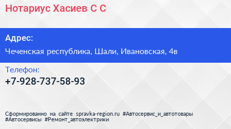Нотариус Хасиев С.С. по адресу Чеченская республика, Шали, Ивановская, 4в в дальнейшем Организация, размещена в следующих категориях: