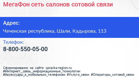МегаФон, сеть салонов сотовой связи по адресу Чеченская республика, Шали, Кадырова, 113 в дальнейшем Организация, размещена в следующих категориях: