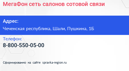 МегаФон, сеть салонов сотовой связи по адресу Чеченская республика, Шали, Пушкина, 1Б в дальнейшем Организация, размещена в следующих категориях: