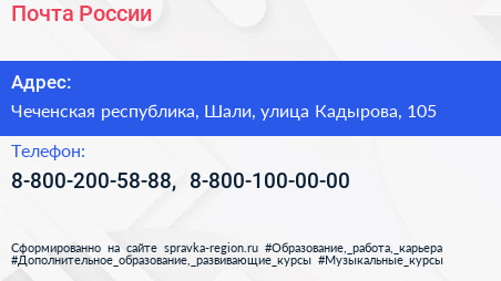 Почта России по адресу Чеченская республика, Шали, улица Кадырова, 105 в дальнейшем Организация, размещена в следующих категориях: