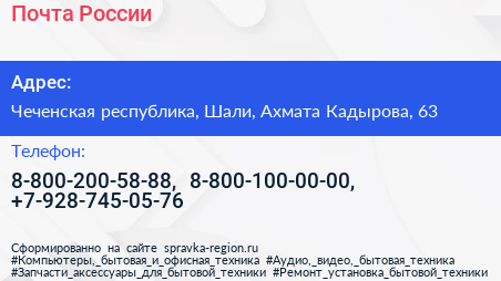Почта России по адресу Чеченская республика, Шали, Ахмата Кадырова, 63 в дальнейшем Организация, размещена в следующих категориях: