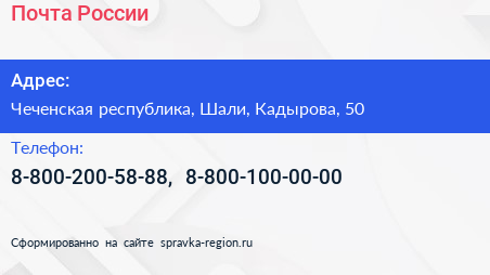Почта России по адресу Чеченская республика, Шали, Кадырова, 50 в дальнейшем Организация, размещена в следующих категориях: