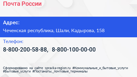 Почта России по адресу Чеченская республика, Шали, Кадырова, 158 в дальнейшем Организация, размещена в следующих категориях: