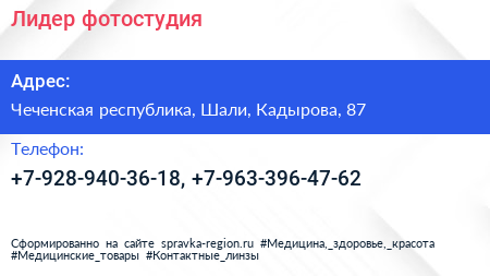 Лидер, фотостудия по адресу Чеченская республика, Шали, Кадырова, 87 в дальнейшем Организация, размещена в следующих категориях: