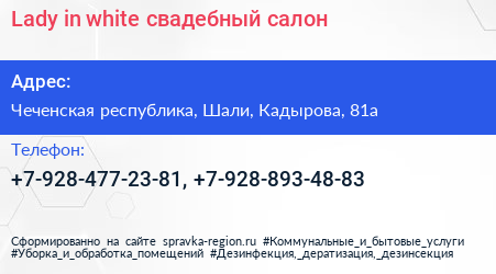 Lady in white, свадебный салон по адресу Чеченская республика, Шали, Кадырова, 81а в дальнейшем Организация, размещена в следующих категориях: