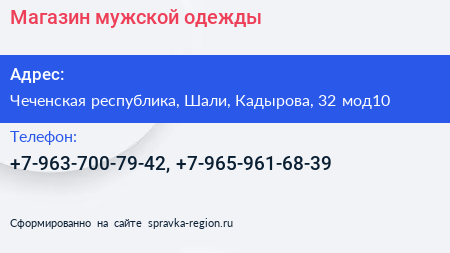Магазин мужской одежды по адресу Чеченская республика, Шали, Кадырова, 32 мод10 в дальнейшем Организация, размещена в следующих категориях: