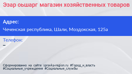 Эзар оьшарг, магазин хозяйственных товаров по адресу Чеченская республика, Шали, Моздокская, 125а в дальнейшем Организация, размещена в следующих категориях: