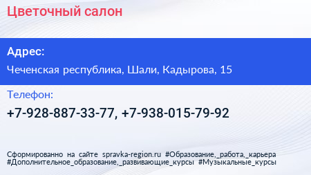 Цветочный салон по адресу Чеченская республика, Шали, Кадырова, 15 в дальнейшем Организация, размещена в следующих категориях: