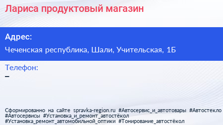 Лариса, продуктовый магазин по адресу Чеченская республика, Шали, Учительская, 1Б в дальнейшем Организация, размещена в следующих категориях: