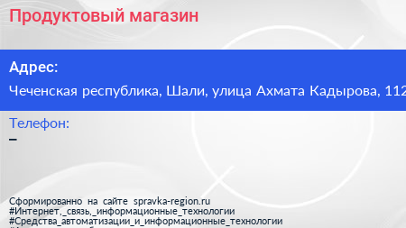 Продуктовый магазин по адресу Чеченская республика, Шали, улица Ахмата Кадырова, 112 в дальнейшем Организация, размещена в следующих категориях: