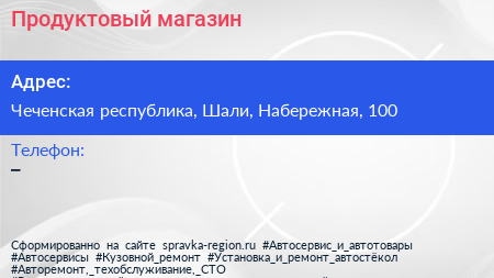 Продуктовый магазин по адресу Чеченская республика, Шали, Набережная, 100 в дальнейшем Организация, размещена в следующих категориях: