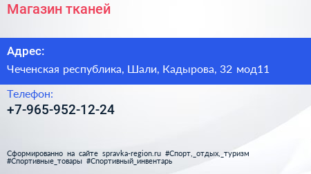 Магазин тканей по адресу Чеченская республика, Шали, Кадырова, 32 мод11 в дальнейшем Организация, размещена в следующих категориях: