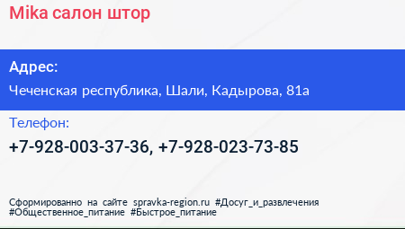 Mika, салон штор по адресу Чеченская республика, Шали, Кадырова, 81а в дальнейшем Организация, размещена в следующих категориях: