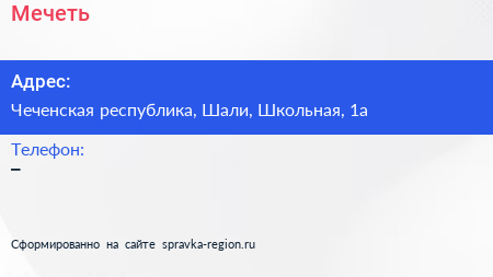 Мечеть по адресу Чеченская республика, Шали, Школьная, 1а в дальнейшем Организация, размещена в следующих категориях: