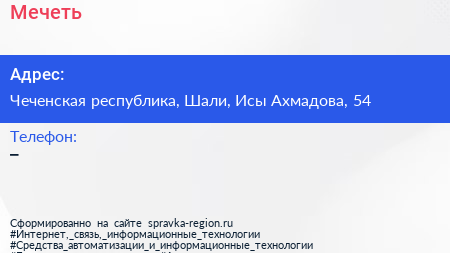Мечеть по адресу Чеченская республика, Шали, Исы Ахмадова, 54 в дальнейшем Организация, размещена в следующих категориях: