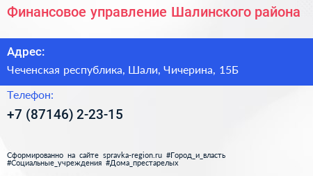 Финансовое управление Шалинского района по адресу Чеченская республика, Шали, Чичерина, 15Б в дальнейшем Организация, размещена в следующих категориях: