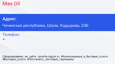 Max Oil по адресу Чеченская республика, Шали, Кадырова, 23Б в дальнейшем Организация, размещена в следующих категориях: