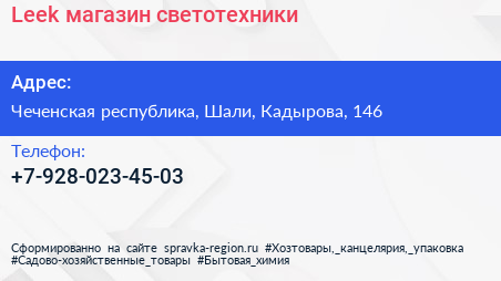 Leek, магазин светотехники по адресу Чеченская республика, Шали, Кадырова, 146 в дальнейшем Организация, размещена в следующих категориях: