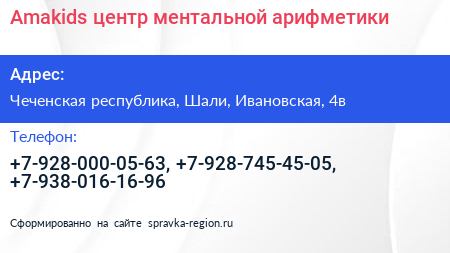 Amakids, центр ментальной арифметики по адресу Чеченская республика, Шали, Ивановская, 4в в дальнейшем Организация, размещена в следующих категориях: